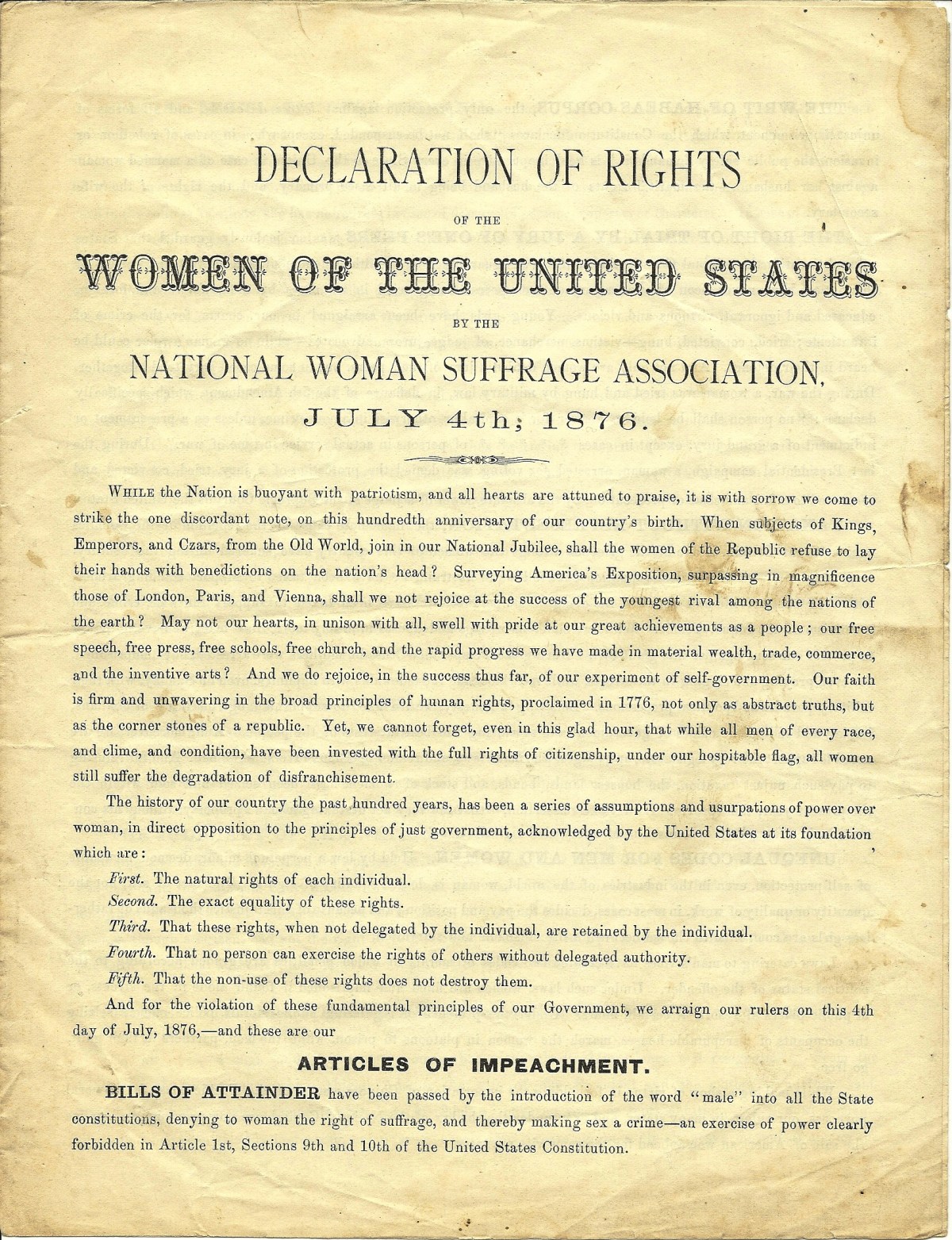 Circular, National Woman Suffrage Association, Declaration of Rights of the Women of the United States . . . July 4th, 1876 (N.p., n.d.).